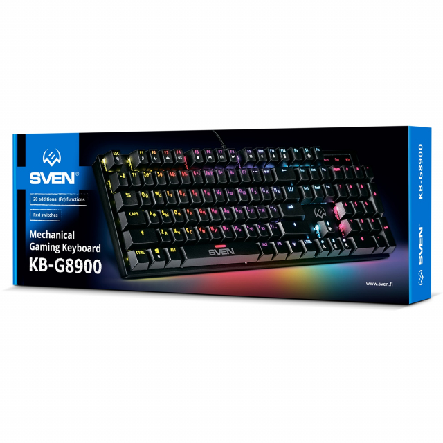 SVEN KB-G8900 Mechanical Backlit Gaming Keyboard, 104 keys, 20 Fn-keys, Backlight, Red switches for a soft and quiet keystroke, 100% abrasion-resistant symbols, Durable braided USB cable, Black, Rus/Eng