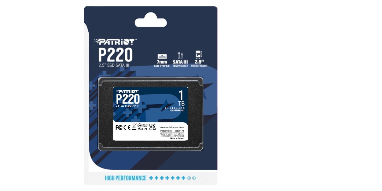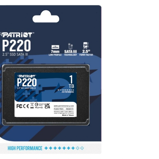 2.5” SSD 1.0TB Patriot P220, SATAIII, Sequential Read: 550MB/s, Sequential Write: 500MB/s, 4K Random Read: 50K IOPS, 4K Random Write: 50K IOPS, SMART, TRIM, 7mm, TBW: 480TB, Phison S12 Controller, 3D NAND TLC