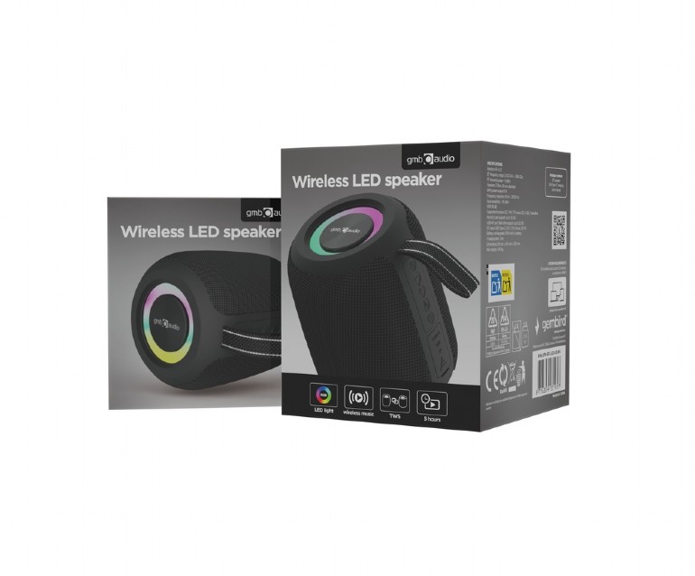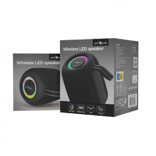 Gembird SPK-BT-LED-05-BK, Bluetooth LED Portable Speaker, 8W RMS, Bluetooth v.5.3, RGB, Built-in microphone, TWS, microSD, built-in lithium battery - 1200 mAh, FM-radio: power and audio cables are anntena, 0.45g, Black