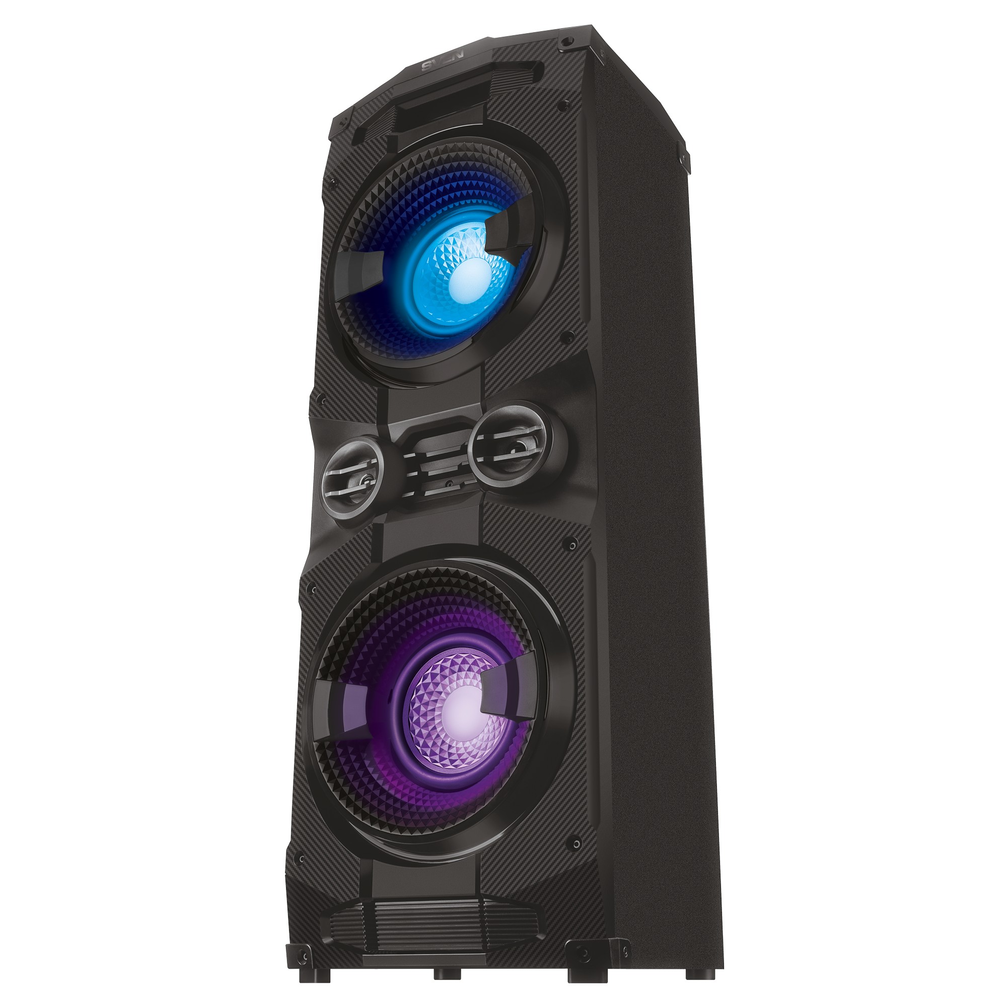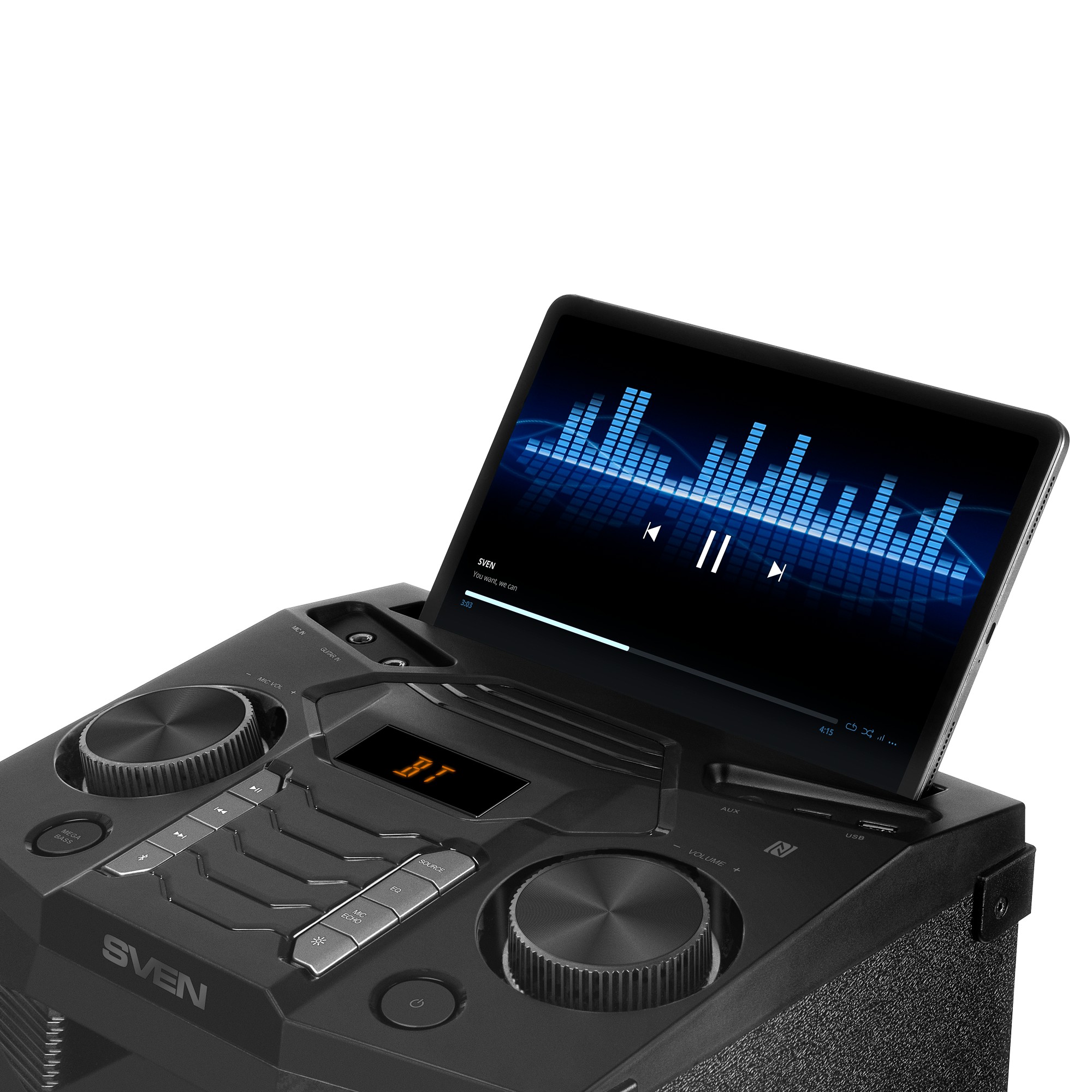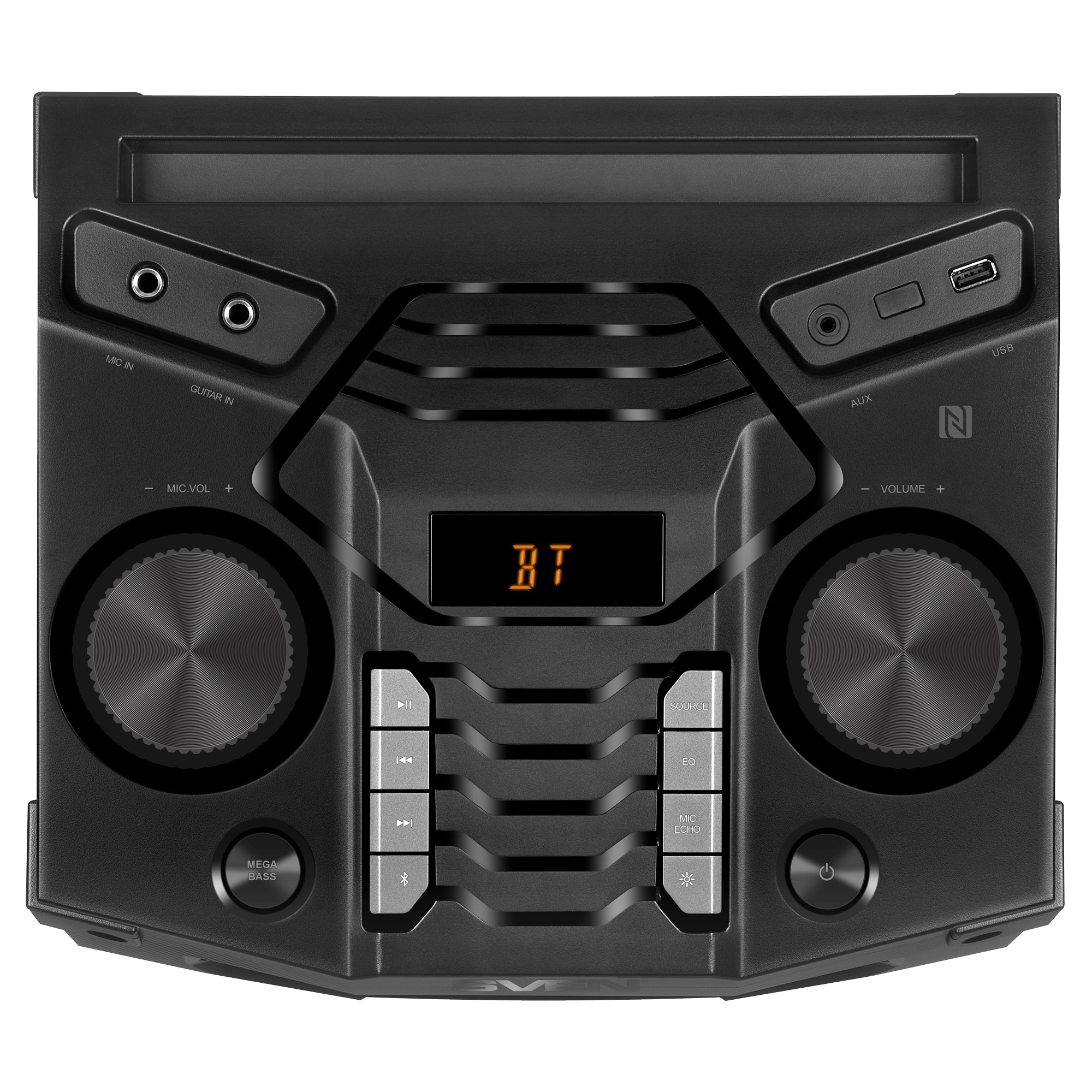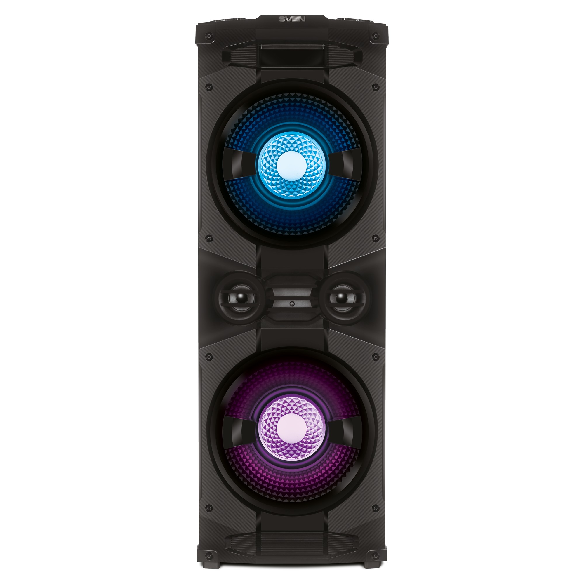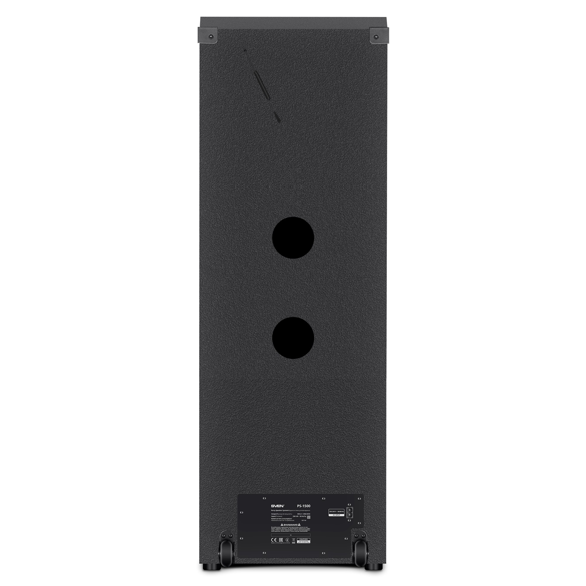 SVEN PS-1500, 500W (2x250) Dynamic switchable RGB backlight, TWS, Bluetooth, FM, USB, LED display, microphone input for karaoke, NFC, Audio input for connecting an electric guitar, Carrying handle and wheels, Wooden body (MDF), 13 kg, Black