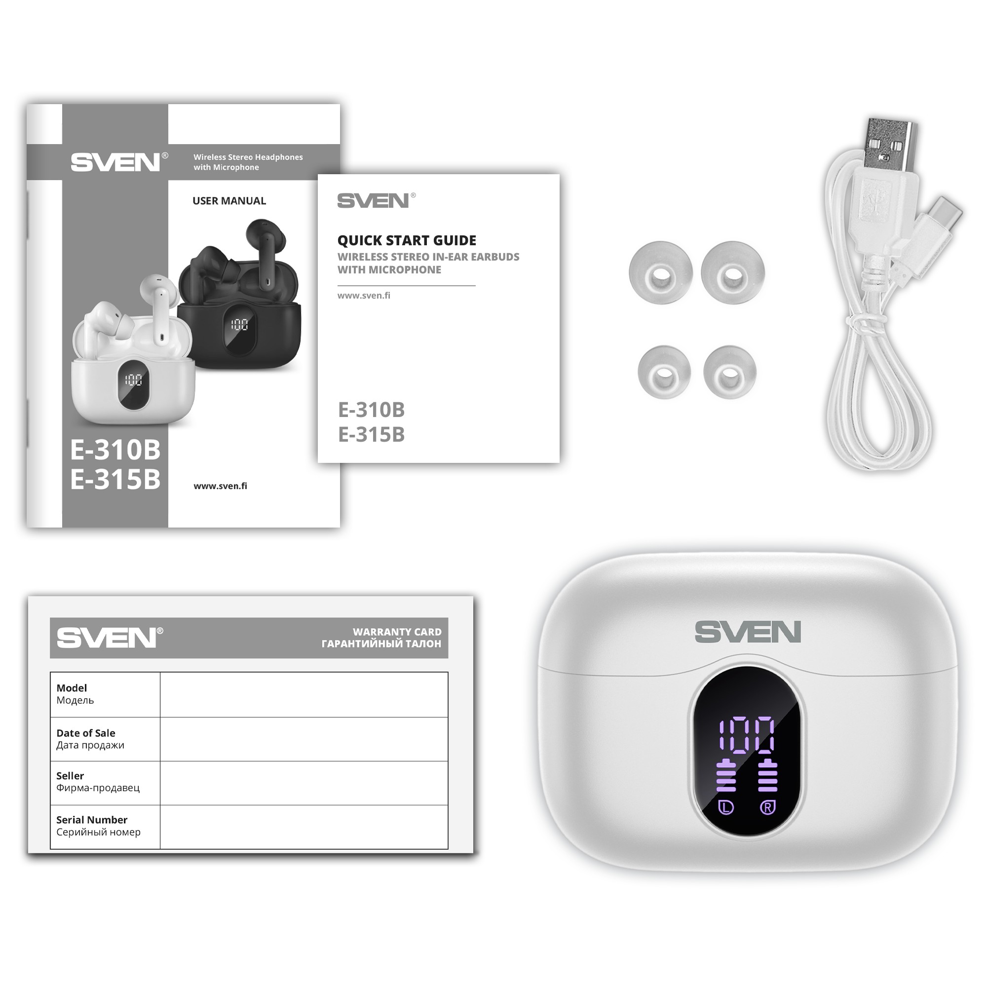 SVEN E-310B, TWS Wireless In-ear stereo earbuds with microphone, Bluetooth 5.4, ANC, ENC, Transparency mode, Game mode, Smart Life app, LED display, ”Find Me” function, 26 hours battery life with the charging case, Sensor buttons, White
