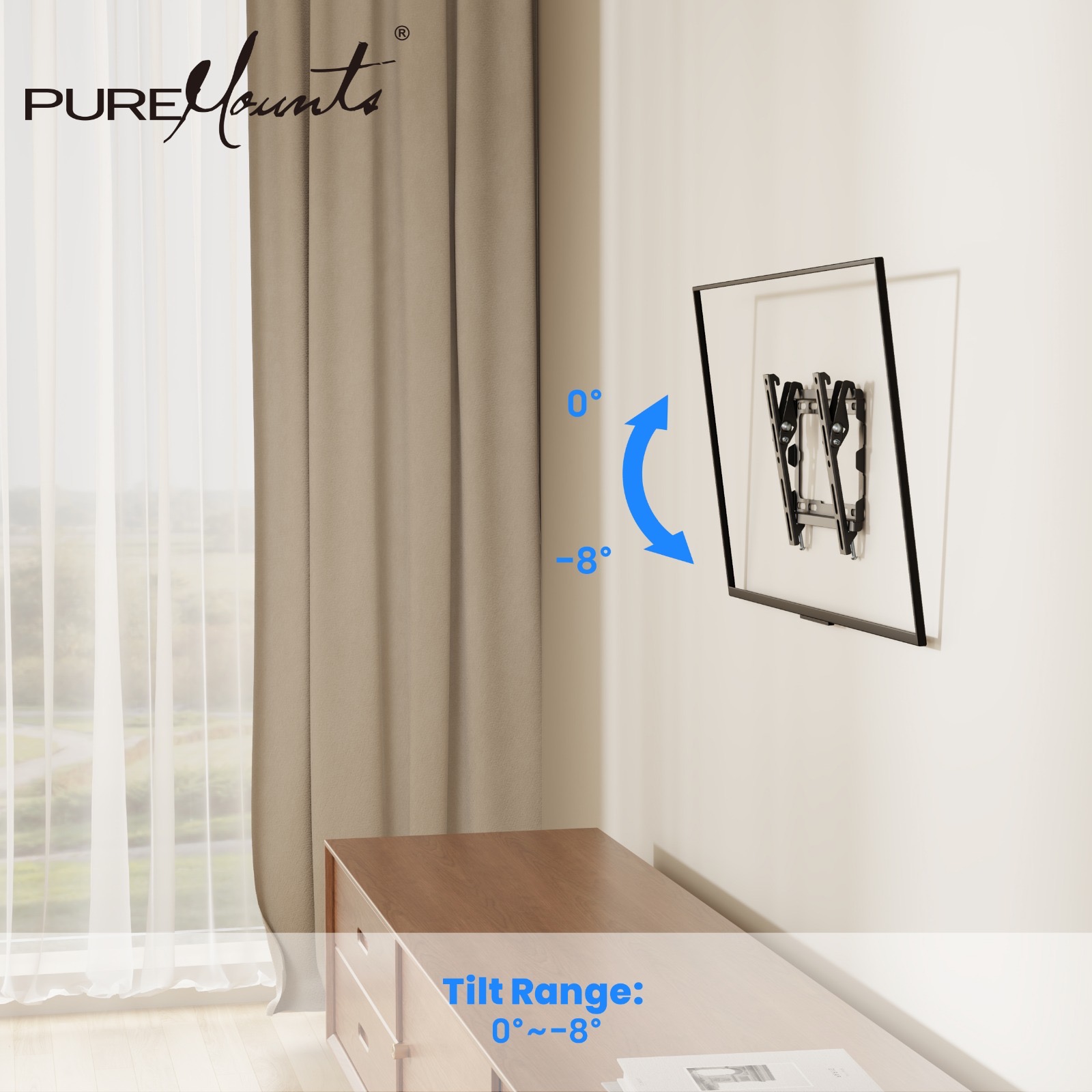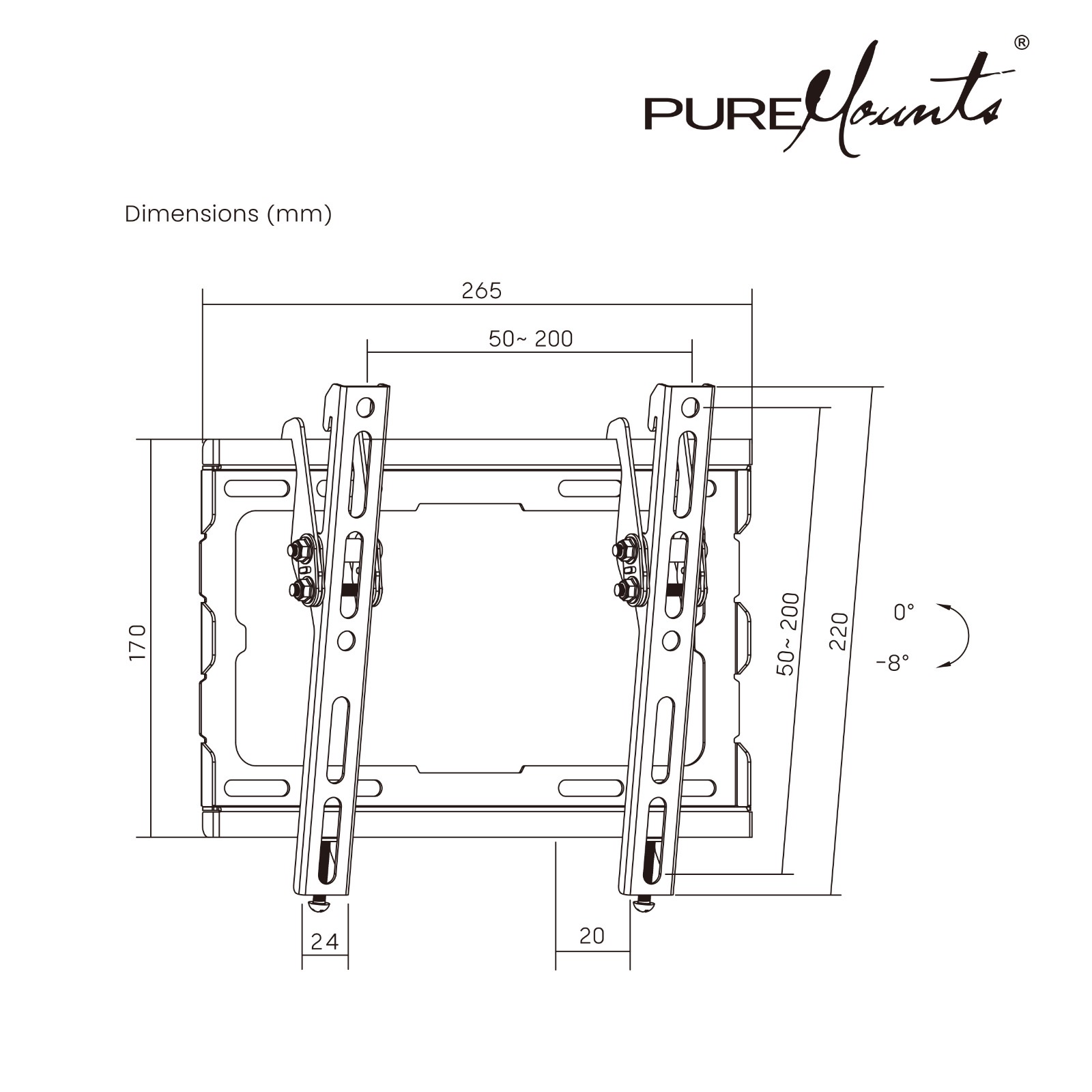 TV-Wall Mount for 23-43” - PureMounts ”BT210”, Tilted, up to 45kg, Tilt: 0/ -8°, ultra slim profil 25mm wall distance, max.VESA 200x200, Steel black