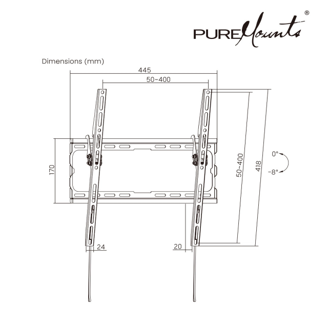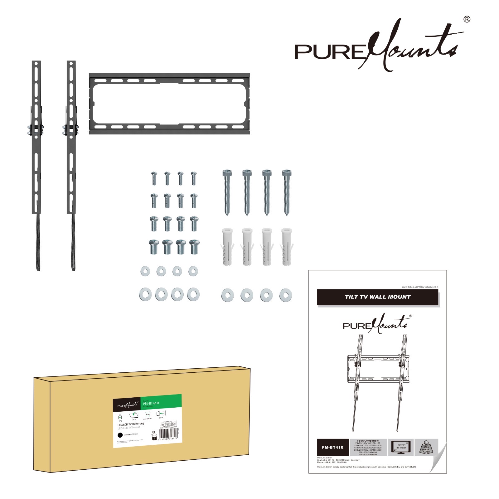 TV-Wall Mount for 26-70” - PureMounts ”BT410”, Tilted, up to 45kg, Tilt: 0/ -8°, ultra slim profil 25mm wall distance, max.VESA 400x400, Steel black