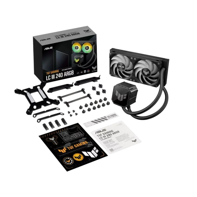 ASUS Liquid Cooler TUF GAMING LC III 240 ARGB, 240mm radiator, Socket Intel LGA 1851,1700,1200 & AM5/AM4, Pre-installed 2x TUF Gaming 120mm ARGB PWM fans:120x120x25mm, 650-2600 RPM, 37.4dBA, 90.78CFM, 3-Phase, 6-slot, Four-pole, Sleeved Rubber Tubing 400mm, PWM-Controlled Pump&Fans, Aura Sync, Black
