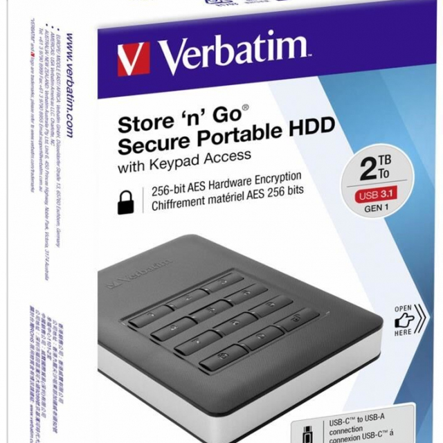 2.5” External HDD 2.0TB (USB3.0/USB-C) Verbatim ”Store 'n' Go with Keypad Access”, Black, AES 256-bit Hardware Encryption, Built-in keypad for password input, Nero Backup Software, Green Button Energy Saving Software