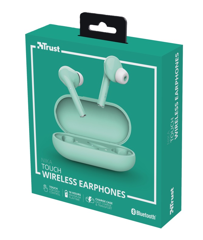 Trust Nika Touch Bluetooth Wireless TWS Earphones - Turquoise, Up to 6 hours of playtime, Manage all important functions (next/previous/pause/play/voice assistant) with a simple touch