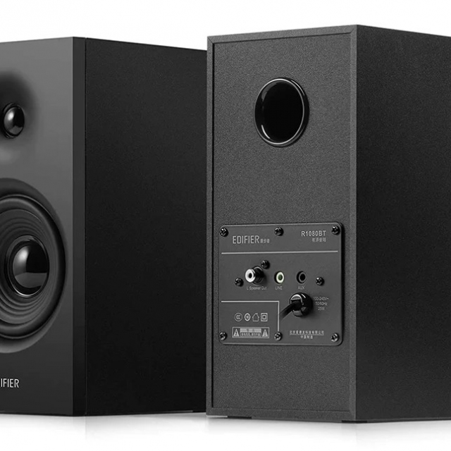Edifier R1080BT Black, 2.0/ 24W (2x12W) RMS, 4” Mid-range and bass drivers + 0.75” treble drivers, built-in DSP chip, Bluetooth V5.1, line In and AUX Inputs, classic wooden enclosure, top-mounted buttons