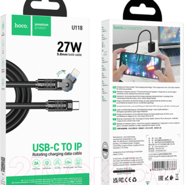 Cable USB to Lighning HOCO “U118 Triumph”, 1.2m, Black, Rotating Charging Data Cable, Apple PD 27W fast charge, Outer material: Zinc alloy
