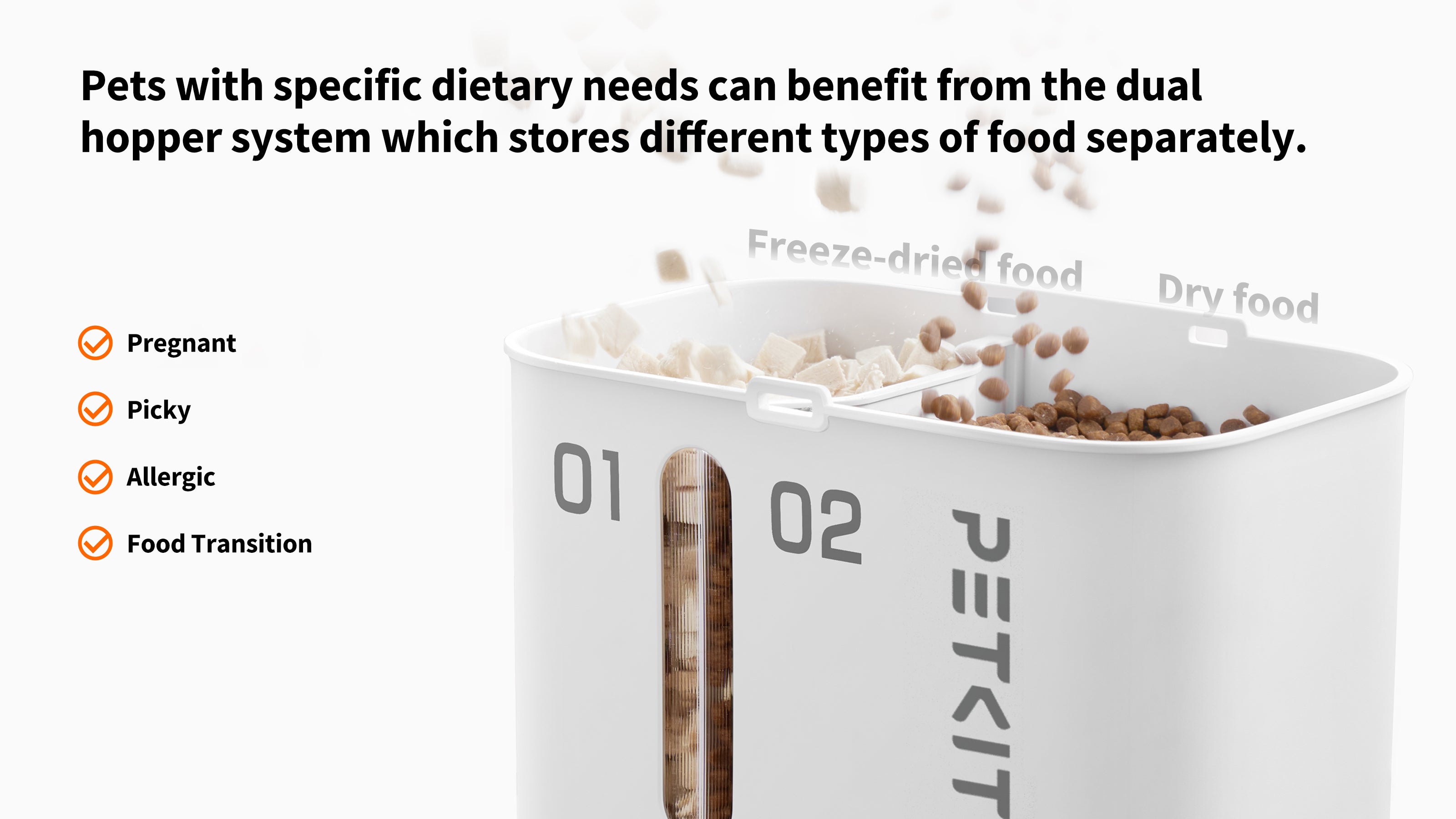 Capacitatea de 21-cup este suficienta pentru a hrani o pisica adulta timp de 30 de zile, ceea ce este potrivit pentru familiile cu mai multe animale de companie. Designul rezervorului dublu ii permite sa depoziteze diferite tipuri de alimente separat, ceea ce este potrivit in special pentru animalele de companie cu cerinte dietetice speciale.