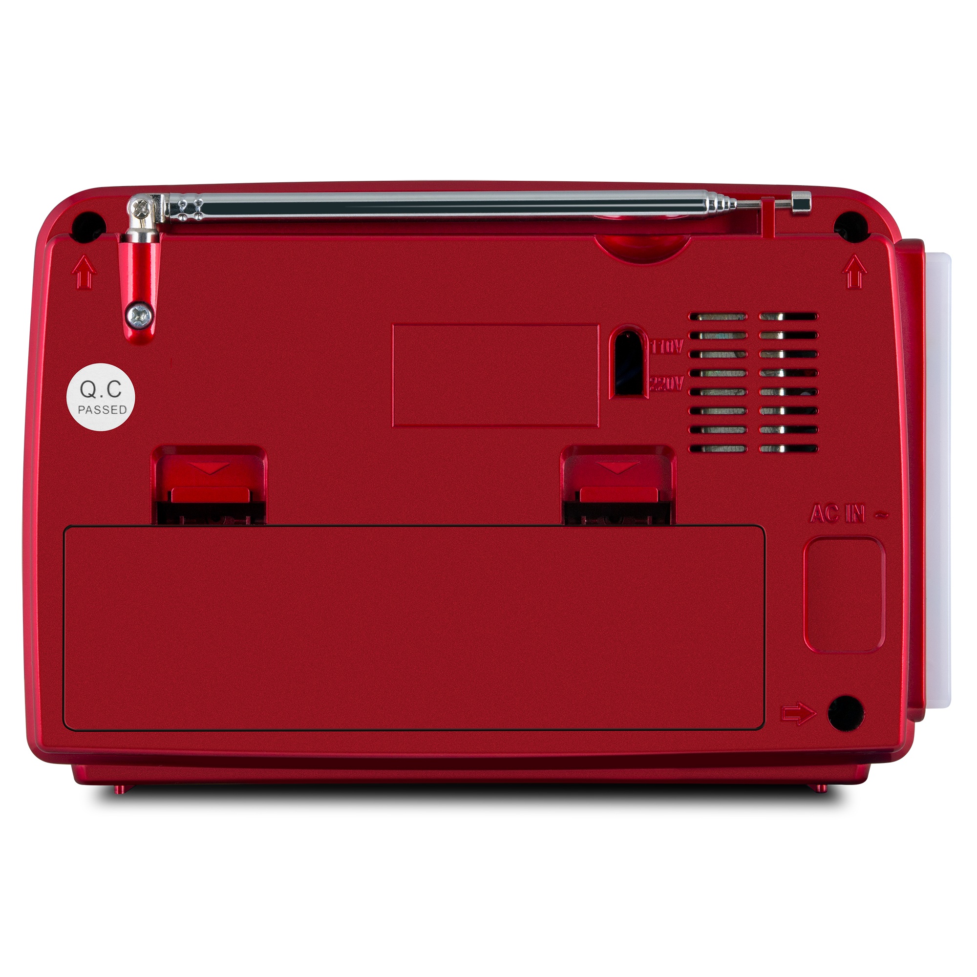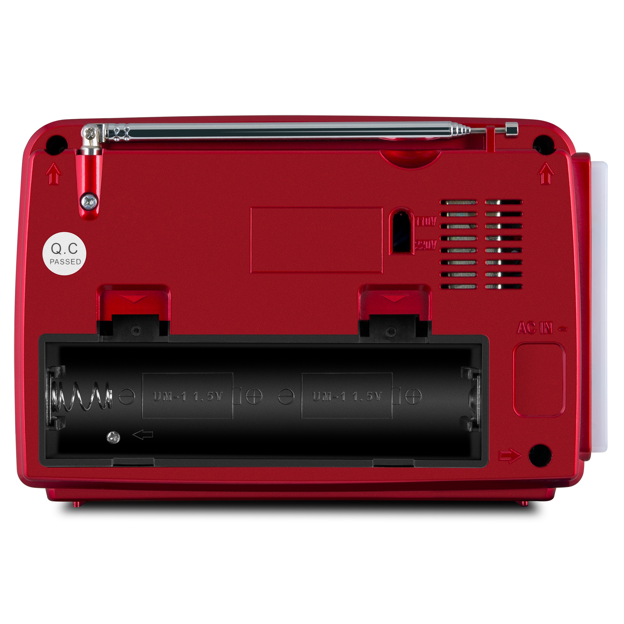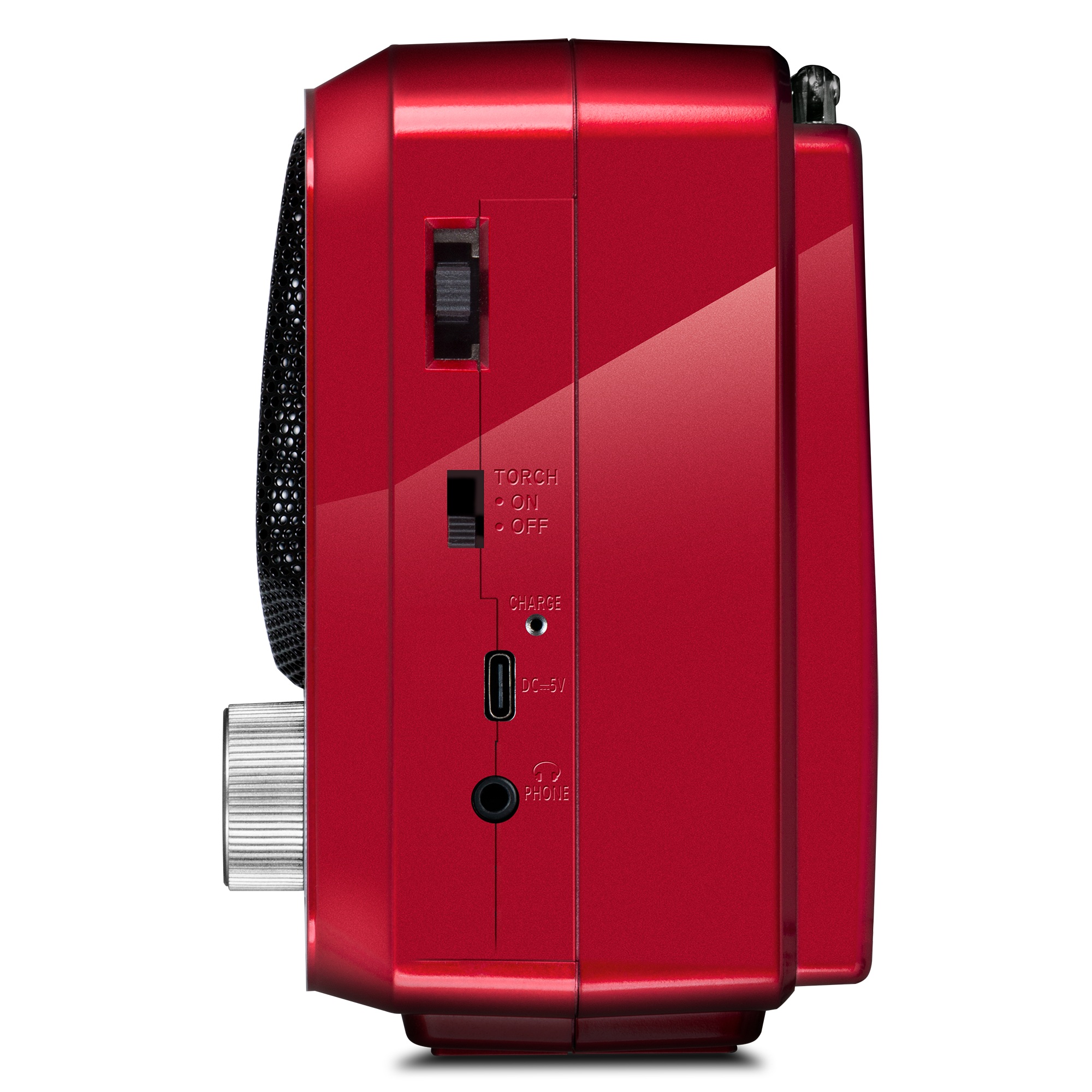 SVEN SRP-150 Red, Bluetooth, FM/AM/SW Radio, 3W RMS, built-in audio files player from USB-fash, microSD card storage devices, telescopic swivel antenna, built-in battery 1200mAh, Embedded flashlight