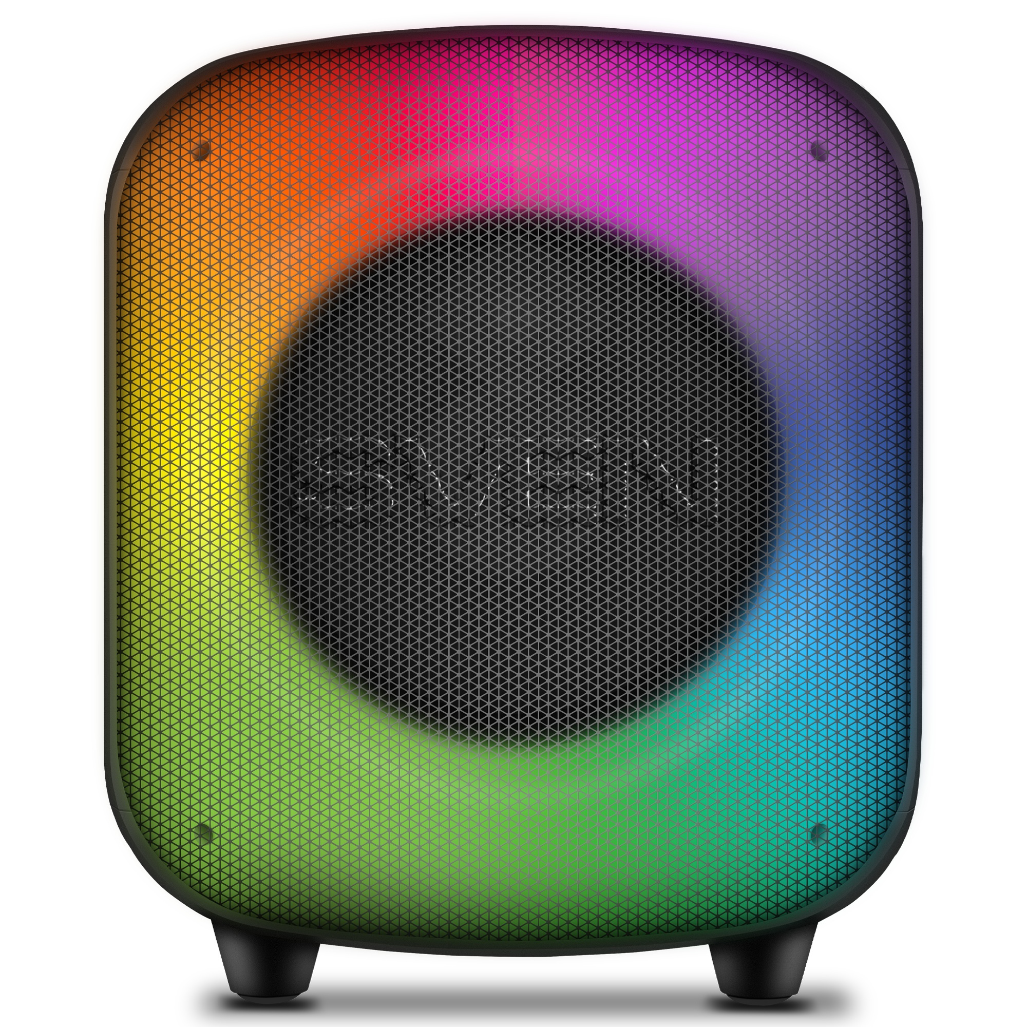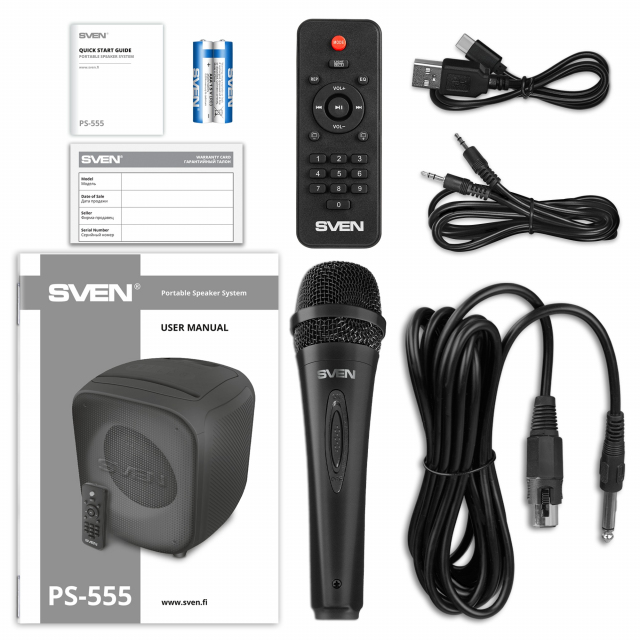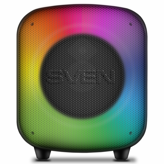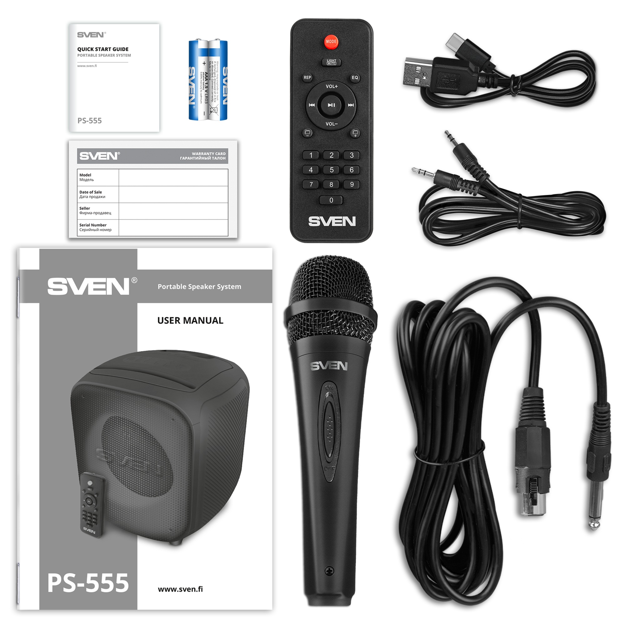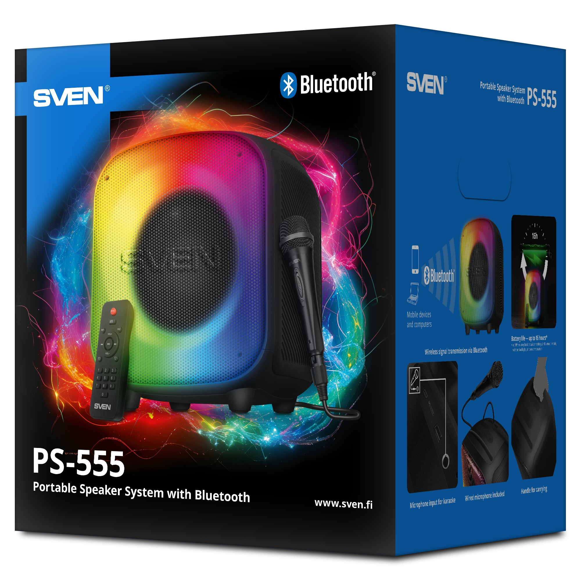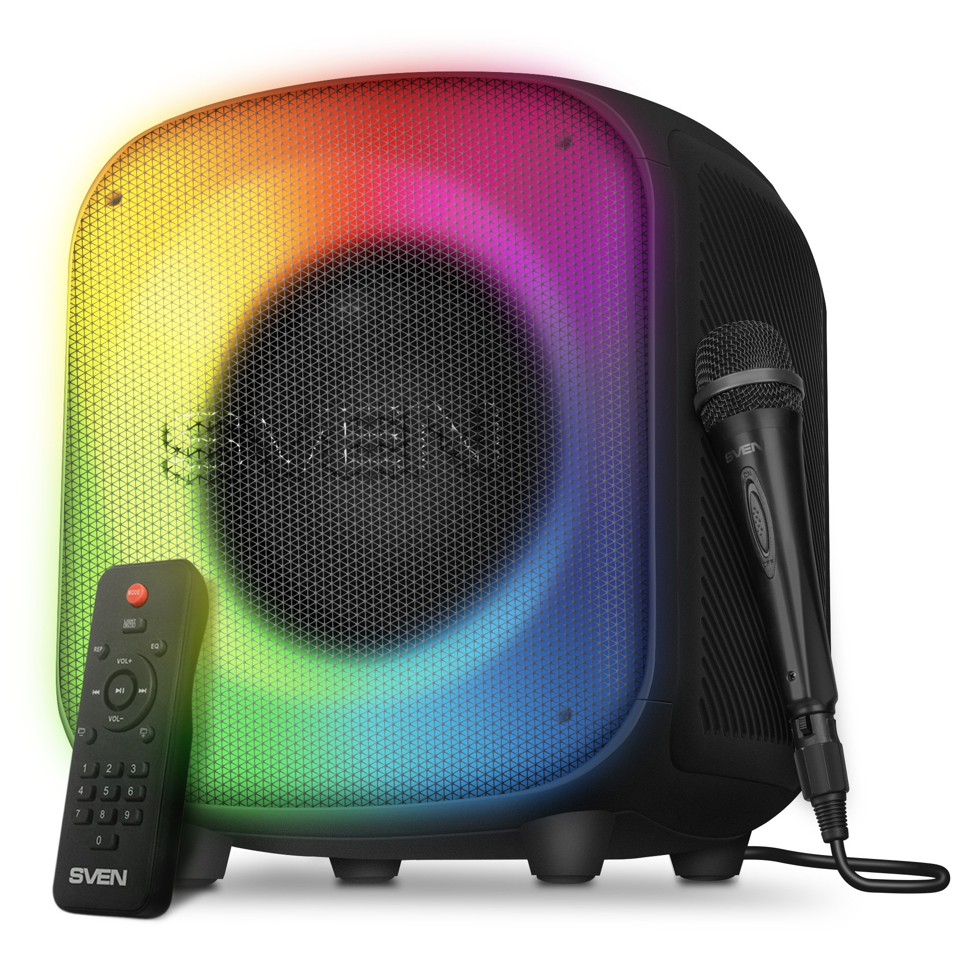 SVEN PS-555 Black, Bluetooth Portable Speaker, 65W RMS, Dynamic switchable RGB backlight, LED display, TWS, USB & microSD, built-in lithium battery 4000 mAh, AUX stereo input, Wired microphone included, Remote control