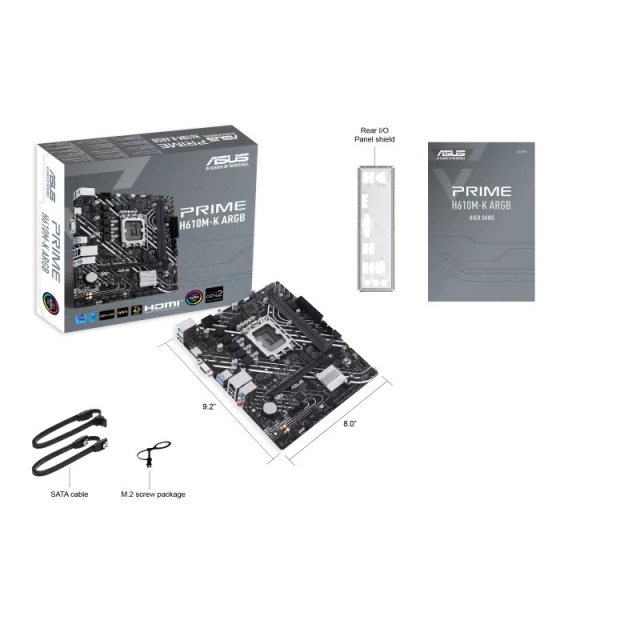 ASUS PRIME H610M-K ARGB, Socket 1700, Intel® H610 (14/13/12th Gen CPU), Dual 2xDDR5-5600, VGA, HDMI, CPU Intel graphics, 1xPCIe X16 4.0, 4xSATA3, 1xM.2, 1xPCIe X1, ALC897 7.1, 1xGbE LAN, 4xUSB3.2, 5X Pro III, Aura Sync, mATX