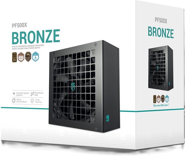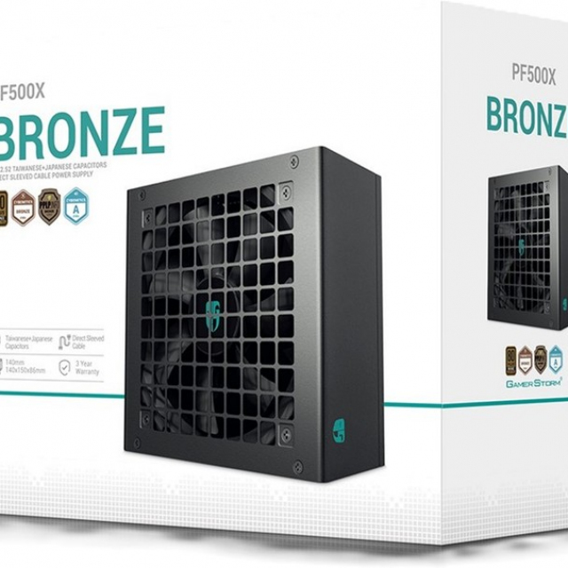 PSU GamerStorm ”PF500X”, 500W, ATX12V V2.52, 80 PLUS®Bronze, Active PFC+Double Forward + DC to DC, 120mm Aerodynamic Long-Life HYB Fan, Taiwanese Capacitors, Sleeved Black Cables, +12V(41A), 20+4 Pin, 1xCPU(4+4Pin), 6x SATA, 2xPCI-E(6+2pin), 2x IDE, OPP, OVP, SCP, OTP, OCP, UVP, SIP, NLO, Black