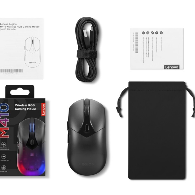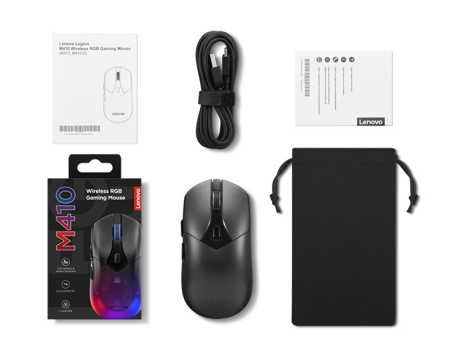 Lenovo Legion M410 Wireless RGB Gaming Mouse, 2.4G and Wired Connection, up to 16.000 DPI, Adjustable 2 zone RGB Light, Rechargeable 800mAh Battery, 6 Buttons, 5 Level DPI Switch.