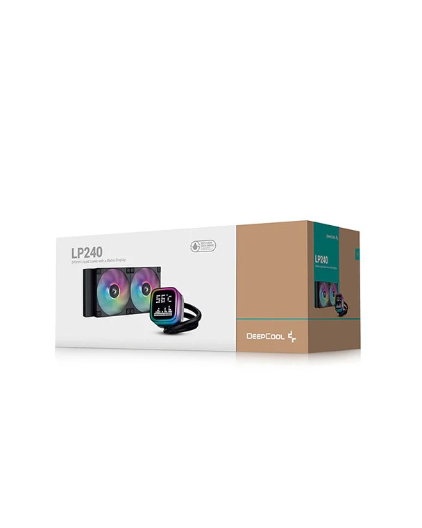 DEEPCOOL Liquid Cooler ”LP240”, 240mm radiator, Anti-Leak Technology, LGA1851/1700/1200/115x & AM5/AM4, up to 280W, 2x 120mm ARGB FD12 fans: 600~2400rpm, <38.71dBA, 72.04CFM, 4-pin PWM, Hydro Bearing, 5 PRO Pump: 3400rpm, 3-phase, 6-slot, 4-pole motor, Dot-matrix Screen, Black
