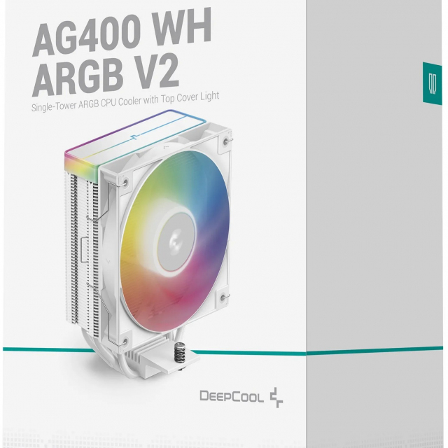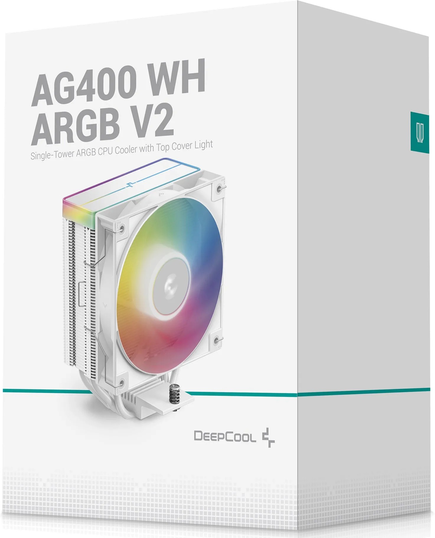 DEEPCOOL Cooler ”AG400 WH ARGB V2”, Intel Socket LGA1851/1700/1200/115x & AMD AM5/AM4, up to 220W, 1x ARGB fan: 120x120x25mm, 500~2100 RPM±10%, <31.6 dB(A), 75.89 CFM, 4-pin PWM, Hydro Bearing, w/ARGB Top Cover & translucent logo design, 4x 6mm Heatpipes direct contact, White