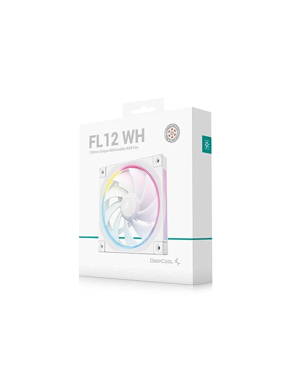 120mm Case Fan - DEEPCOOL ”FL12 WH”, High-Performance 120mm PWM fan, 120x120x25 mm, 500~2150 RPM±10%, 55CFM, <32dB(A), 4-pin PWM, Fluid Dynamic Bearing, Luminous HALO, 3-Phase, 4-Pole, 6-Slot motor, 8-pin connectors, integrated with PWM and ARGB SYNC, White