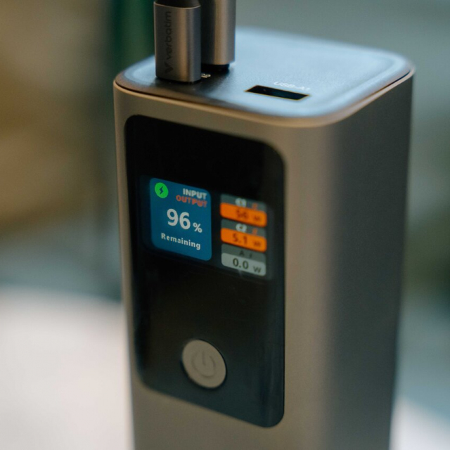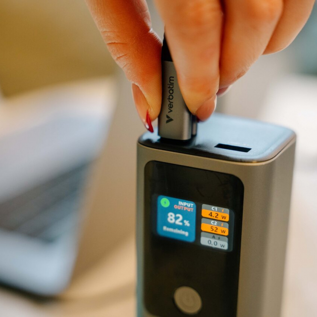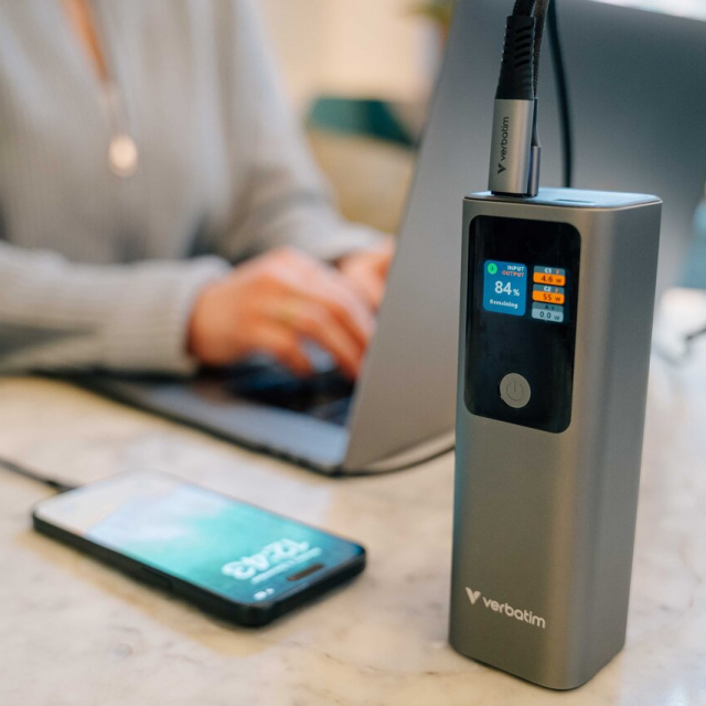27000mAh Power bank - Verbatim Charge'n'Go Power Bank for laptops, tablets and smartphones, Li-ion Battery Capacity: 27,000mAh / 99.9Wh, 3.7V, Total Output: 183W max., Smart digital TFT display, dual USB-C supporting PD 3.1 fast charging up to 140W, USB-C to USB-C 35cm cable 650g, Metal, Grey