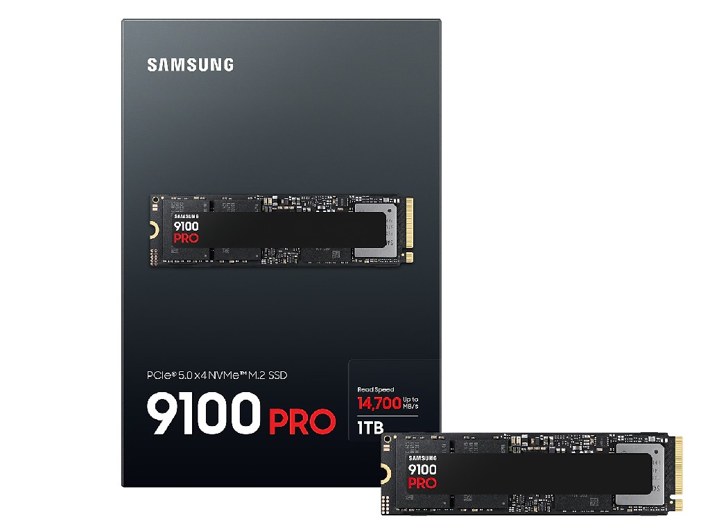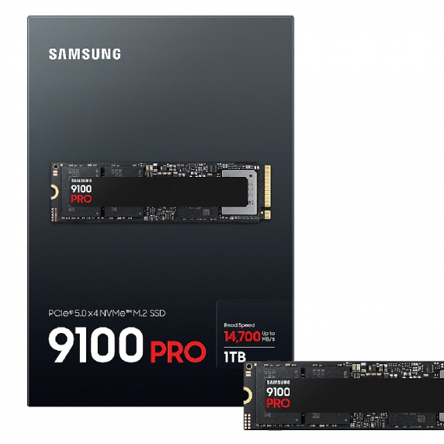 M.2 NVMe SSD 1.0TB Samsung SSD 9100 PRO, PCIe5.0 x4 / NVMe2.0, M2 Type 2280 form factor, Seq. Read: 147000 MB/s, Seq. Write: 13400 MB/s, Max Random 4k: Read /Write: 1850K/2600K IOPS, Class 0 (AES 256), TCG/Opal v2.0, MS eDrive (IEEE1667), 1GB LPDDR4X, 600TBW, V-NAND TLC(V8)