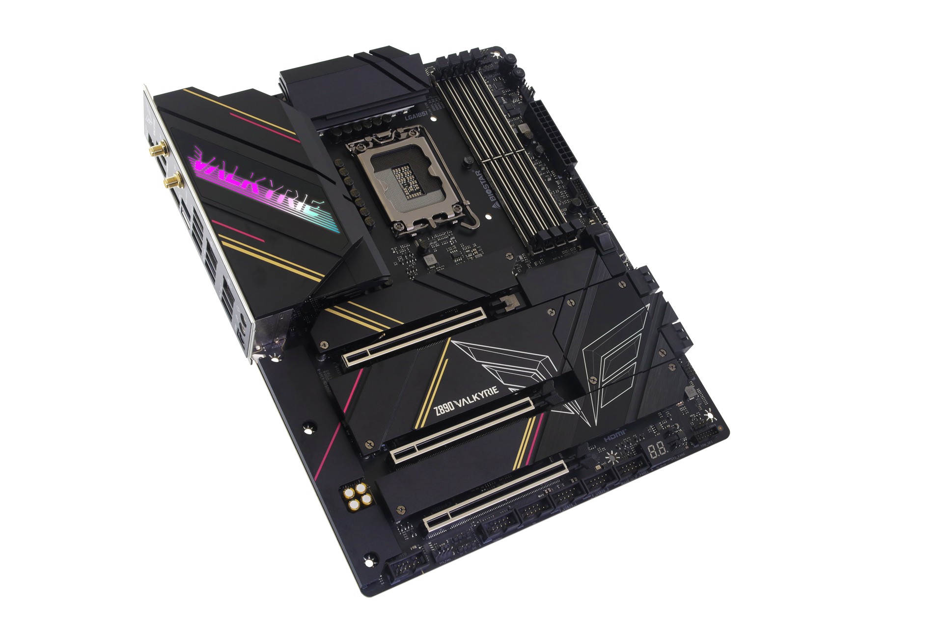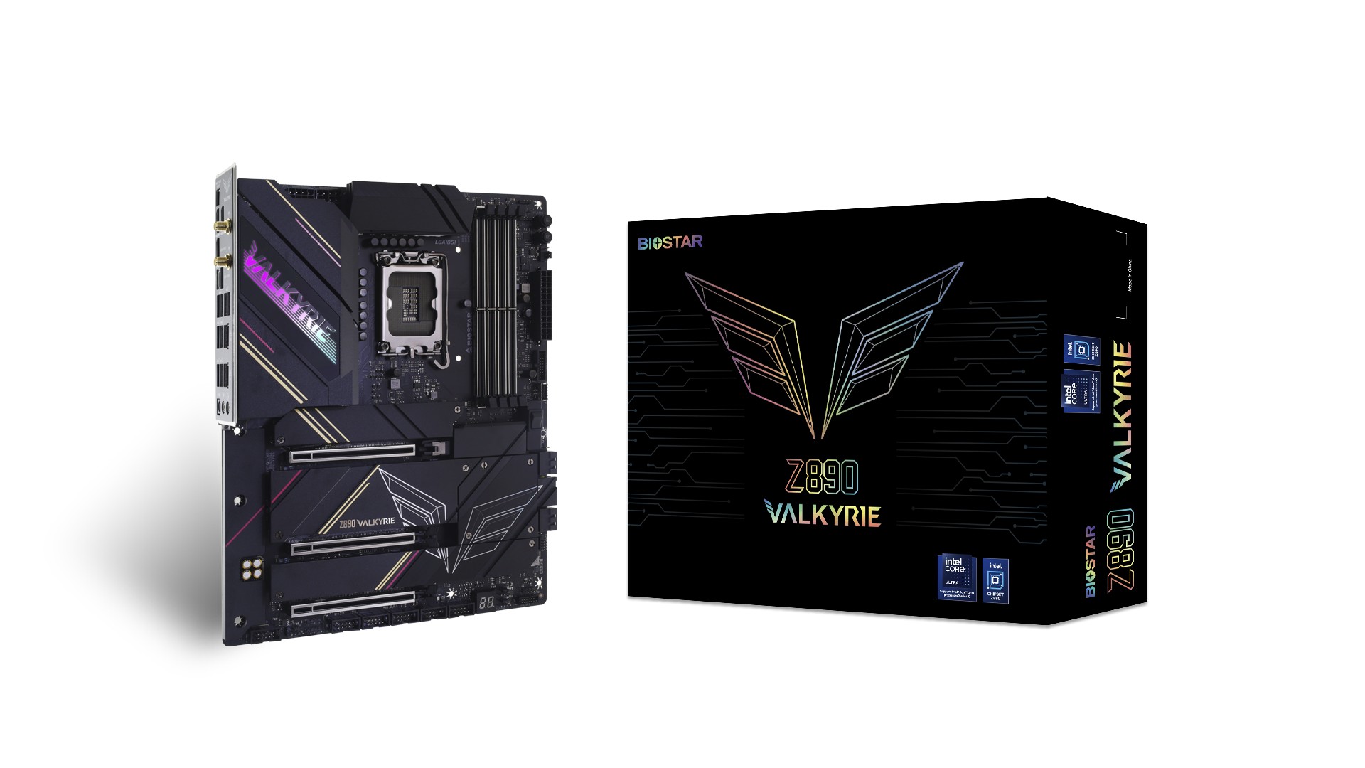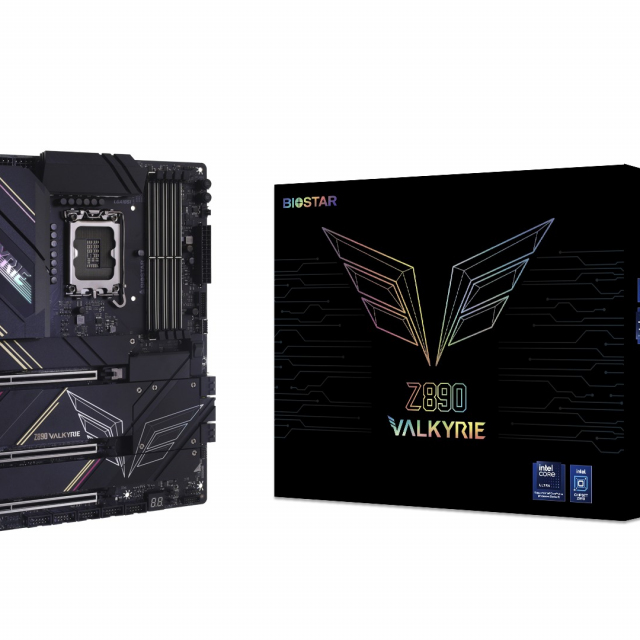 BIOSTAR Z890 VALKYRIE, Socket 1851, 22Phases, Intel® Z890 (Ultra 2 Series CPU), CPU graphics, 2xHDMI, DP, Dual 4xDDR5-9066, 3xPCIe X16 5.0, 4xSATA3, RAID, 6xM.2 5.0, 1xWiFi M.2 Key E, ALC1220, 1x5GbE, 2.5GbE LAN, 1xUSB-C4.0, 1xUSB-C 3.2Gen2x2, 11xUSB3.2Gen2, Vivid DJ LED, Black, ATX