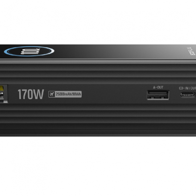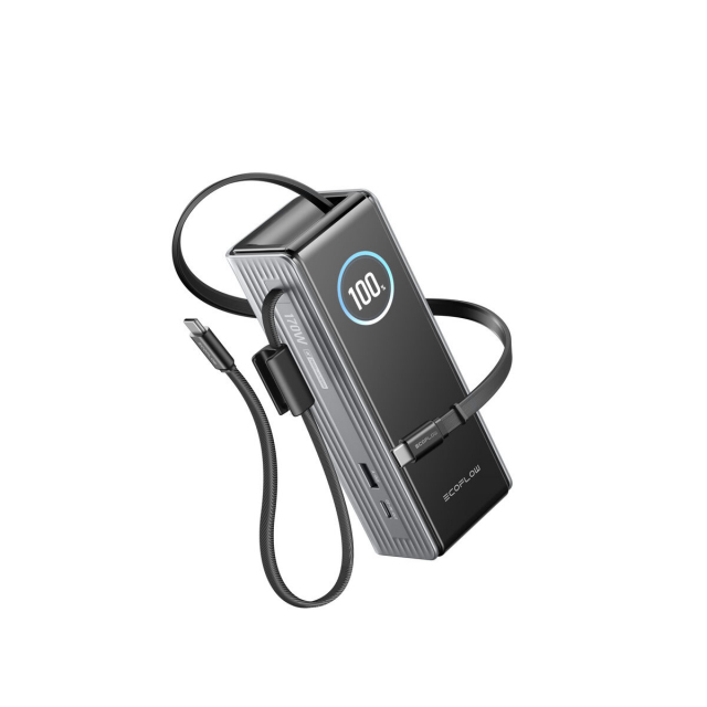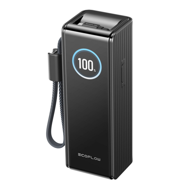 EcoFlow Rapid 25K Power Bank, 25.000mAh (90,00 Wh) Air-travel-friendly, 100W Built-In and Retractable Cables, 100W single port output, 170W total output, 2 Type-C ports: 140W, 1 USB-A port: 33W, TFT Display, 157x54x49mm, 580g, 1 m drop resistant, Black