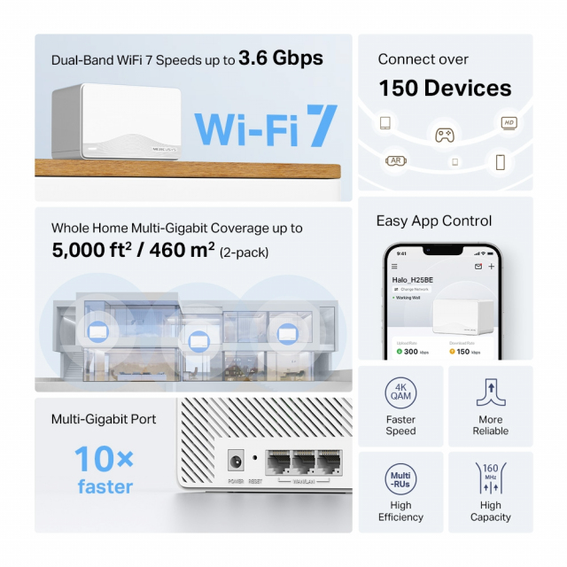 MERCUSYS Halo H25BE(2-pack) BE3600 Whole Home Mesh Wi-Fi 7 System, 3x 1 Gbps Ports (WAN/LAN auto-sensing), 2880Mbps on 5GHz + 688Mbps on 2.4GHz, 802.11ac/b/g/n, Beamforming, Seamless Roaming with One Wi-Fi Name, Parrents control