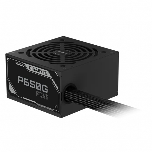 PSU GIGABYTE ”GP-P650G PG5”, 650W, PCIE 5.1, ATX12V V3.1, 80 PLUS® Gold, Flat Black Cables, Active PFC, Main Japan Cap, 120mm HYB Fan with PWM, +12V (54.2A), 20+4 Pin, 2xCPU(4+4Pin), 6x SATA, 2xPCI-E(6+2pin), 3x Peripheral, 1x16-pin PCI-E 300W, OVP/OPP/SCP/UVP/OCP/OTP, Black