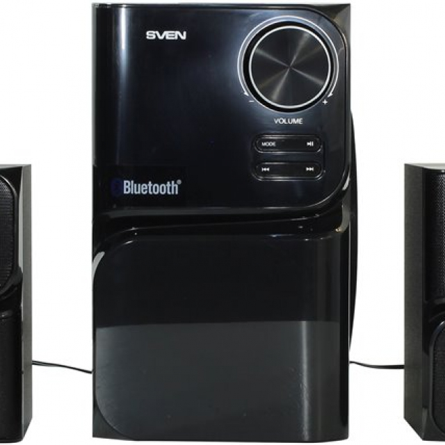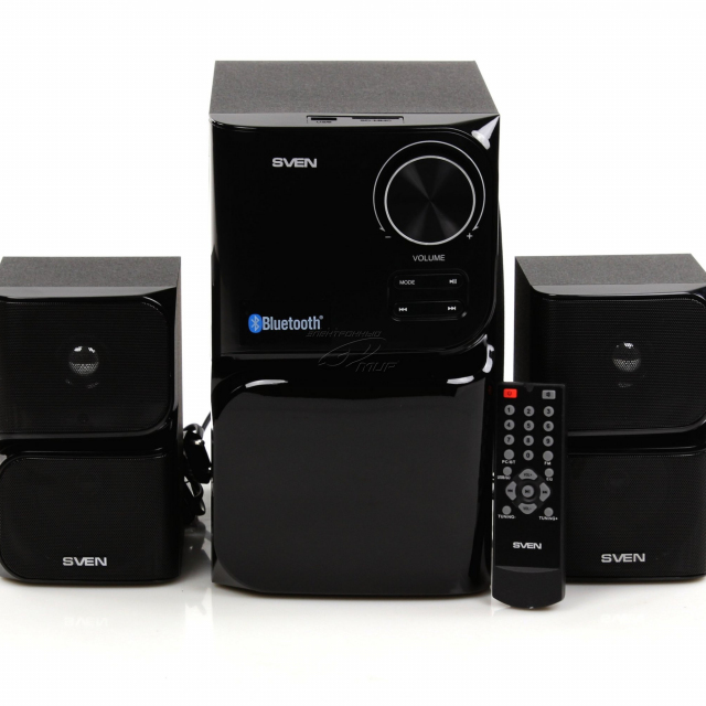 SVEN MS-305 Black, 2.1 / 20W + 2x10W RMS, Bluetooth v. 2.1 +EDR, Digital LED display, FM-tuner, USB flash, SD card, remote control, Headphone input, glossy black front panels, wooden.