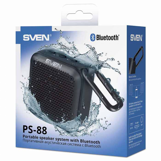 SVEN PS-88 Black, Bluetooth Waterproof Portable Speaker, 7W RMS, Water protection (IPx7), LED display, Support for iPad & smartphone, FM tuner, USB & microSD, TWS, built-in lithium battery -1500 mAh, ability to control the tracks, AUX stereo input