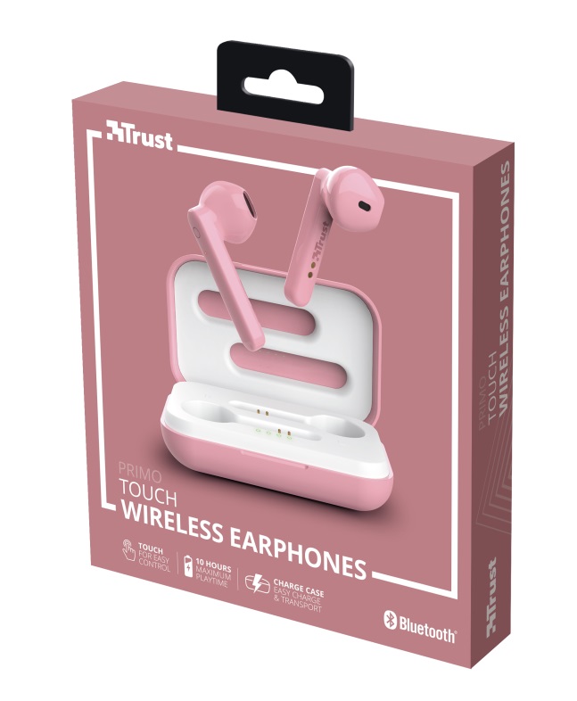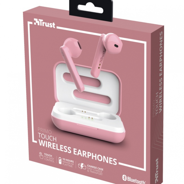 Trust Primo Touch Bluetooth Wireless TWS Earphones - Pink, Up to 4 hours of playtime, Manage all important functions (next/previous/pause/play/voice assistant) with a simple touch