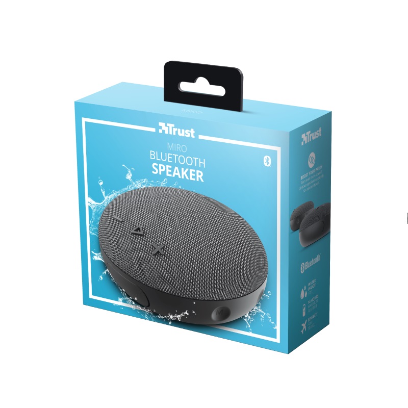 Trust Miro Compact Bluetooth Wireless Speaker 5W, 52mm Speaker units, Waterproof IPX7, Up to 14 hours, Link two speakers wirelessly to boost your party, Bluetooth and aux input, built-in microphone, Black