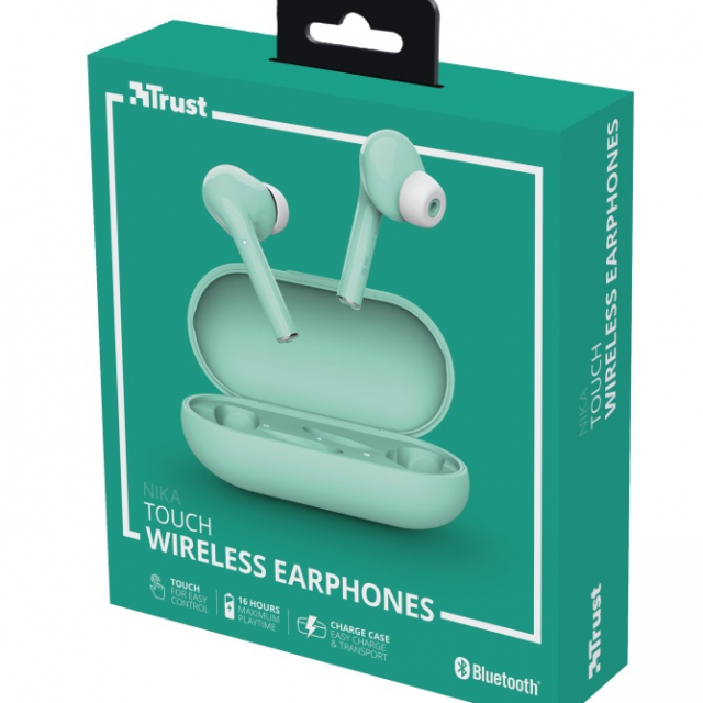 Trust Nika Touch Bluetooth Wireless TWS Earphones - Turquoise, Up to 6 hours of playtime, Manage all important functions (next/previous/pause/play/voice assistant) with a simple touch