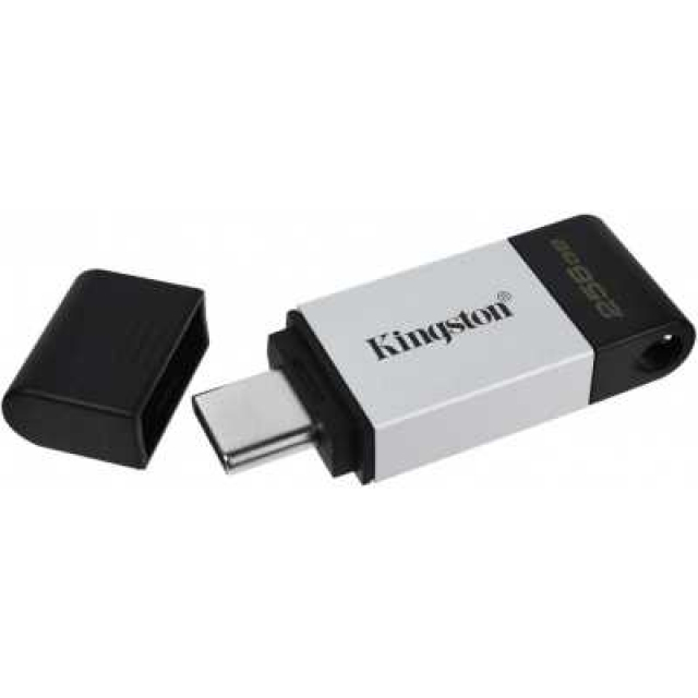 256GB USB-С3.2 Kingston DataTraveler 80, Black/Silver, USB-C, Cap design, Stylish and slim metal & plastic casing fits, Keyring Loop (Read 200 MByte/s, Write 60MByte/s)