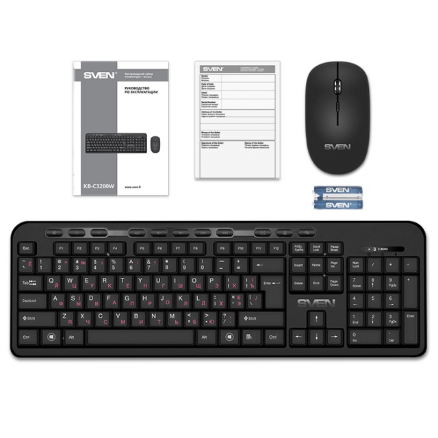 SVEN KB-C3200W, Wireless, Multimedia Keyboard & Mouse, 2.4GHz, (115 keys, 11 Fn-keys) + Mouse (3 + 1 (scroll wheel), 800/1200/1600 dpi), Nano receiver, USB, Black, Rus/Ukr/Eng