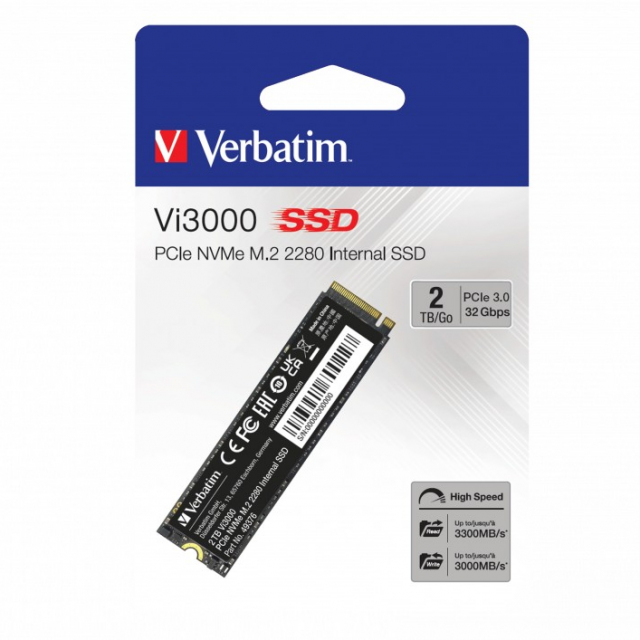 M.2 NVMe SSD 2.0TB Verbatim Vi3000, Interface: PCIe3.0 x4 / NVMe 1.3, M2 Type 2280 form factor, Sequential Read 3100 MB/s, Sequential Write 2200 MB/s, Random Read 150K IOPS, Random Write 100K IOPS, Phison E13T, TBW: 1500TB, 3D NAND TLC