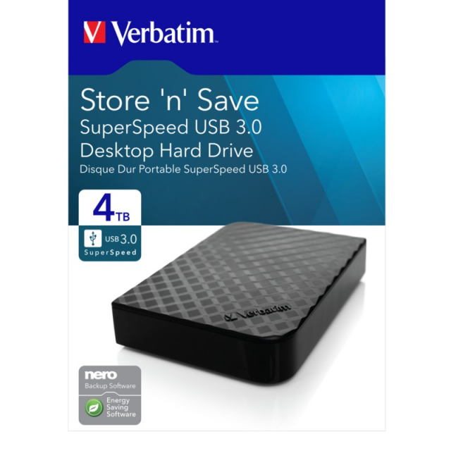 3.5” External HDD 4.0TB (USB3.0) Verbatim ”Store 'n' Save”, Black, External power: +12VDC Input, Nero Backup Software, Green Button Energy Saving Software