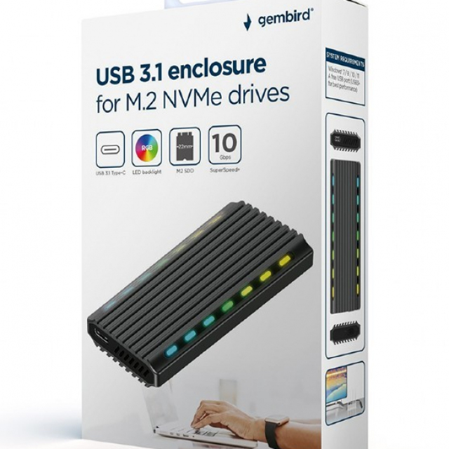 USB enclosure for M.2 NVMe drives, USB 3.1 gen 2 (10 Gbps), RGB LED backlight, aluminum, support: M.2 of 22 mm 2230, 2242, 2262, 2280, SATA and NVMe; M-, B-, M+B key, 0.20m cable USB-C/A