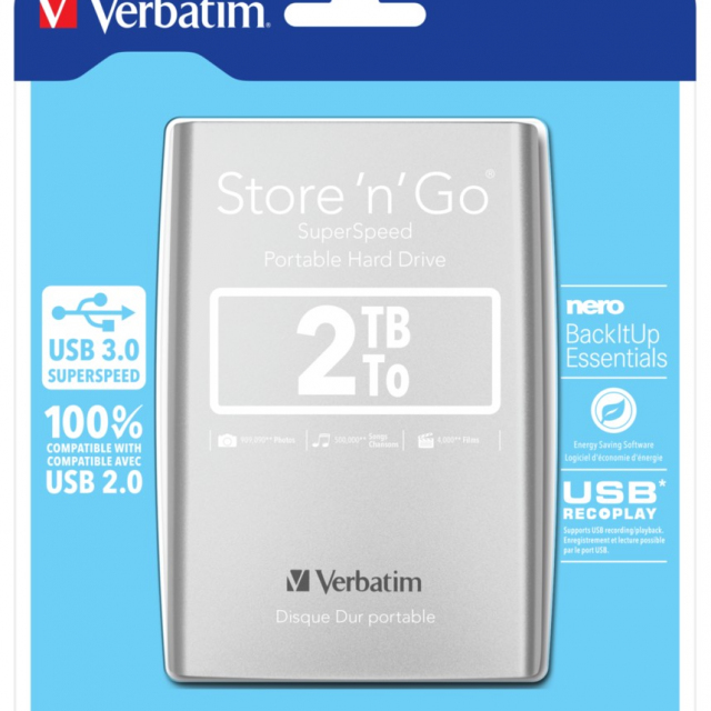 2.5” External HDD 2.0TB (USB3.0) Verbatim ”Store 'n' Go” G1, Silver, Nero Backup Software, Green Button Energy Saving Software