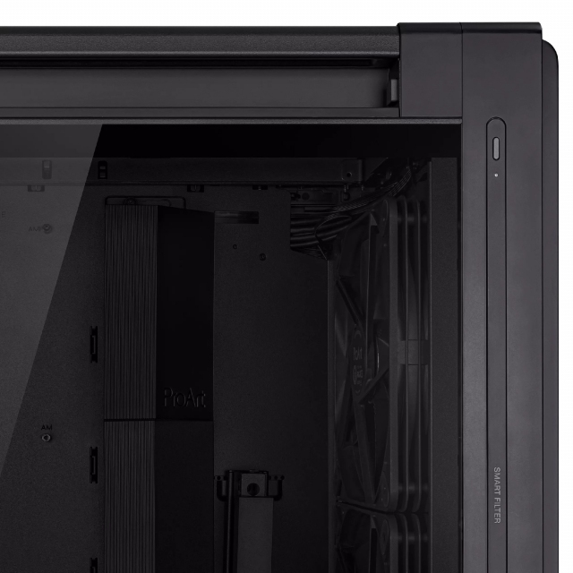 PA602 ASUS PROART TG PWM BLACK CASE, w/o PSU, Front panel IR dust indicator, 420mm radiator support, Integrated Fan Hub, Front: 2x200mm, Rear: 1x140mm, 8x 2.5”/4x 3.5”, 1xUSB-C 20Gbps, 2xUSB3.2, 2xUSB, 1xAudio, Power Lock Latch, Fan Speed Control Button, 15.8kg, EATX