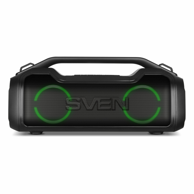 SVEN PS-390 Black, Bluetooth Portable Speaker, Waterproof (IPx5), Dynamic switchable RGB backlight, 50W RMS, MicroSD, FM tuner, USB Type-C, TWS, built-in lithium battery - 3600 mAh, Power Bank function, AUX stereo input