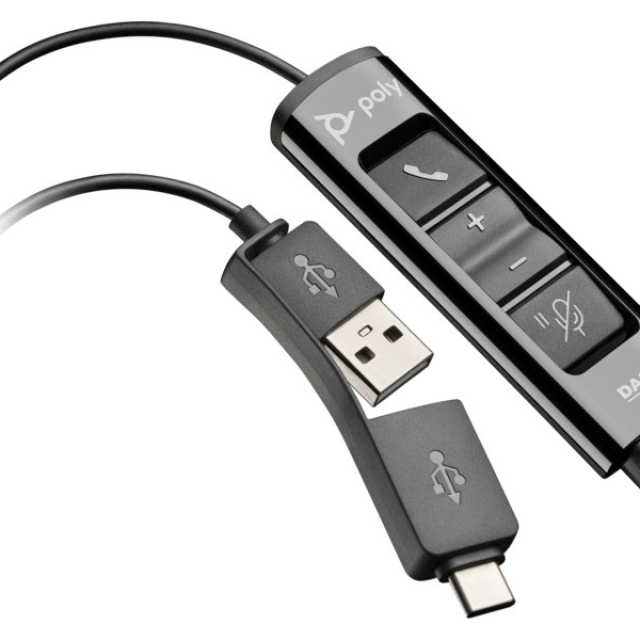 Poly DA85 USB to QD Adapter, built-in USB-A and USB Type-C connectors, Poly Quick Disconnect technology works with any Poly QD-equipped headset, Black