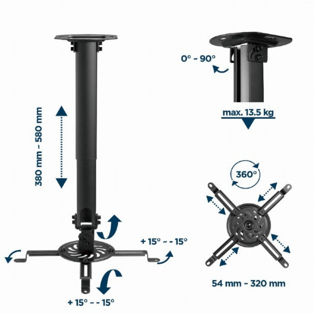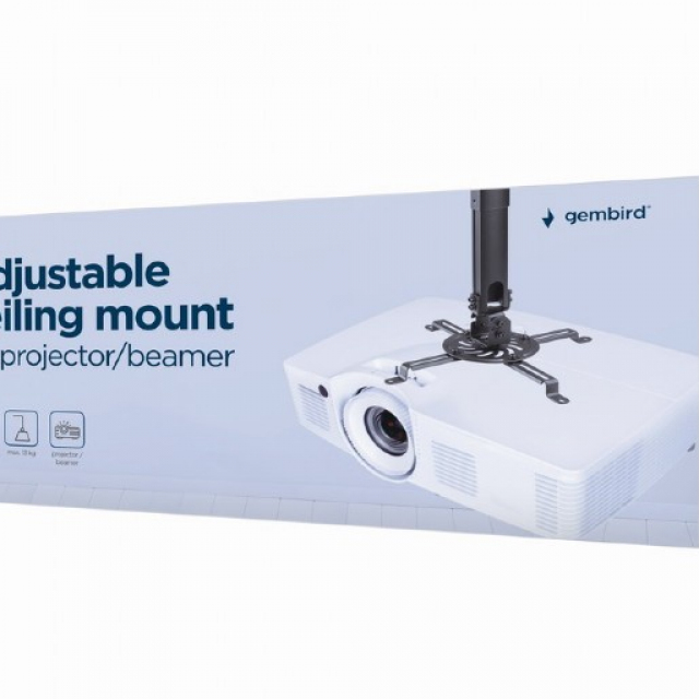 Gembird adjustable ceiling mount for projector/beamer, tilt: +/- 15°, swivel:+/- 15°, rotade: 360°, Height adjustment: 380 ~ 580 mm, max 13kg, Black