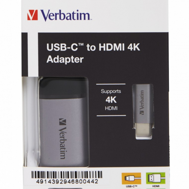Adapter Verbatim USB Type-C to HDMI 4K adapter, USB 3.1 GEN 1 / HDMI (60Hz), Supported resolutions: up to 4K at 60 Hz, 10 cm cable