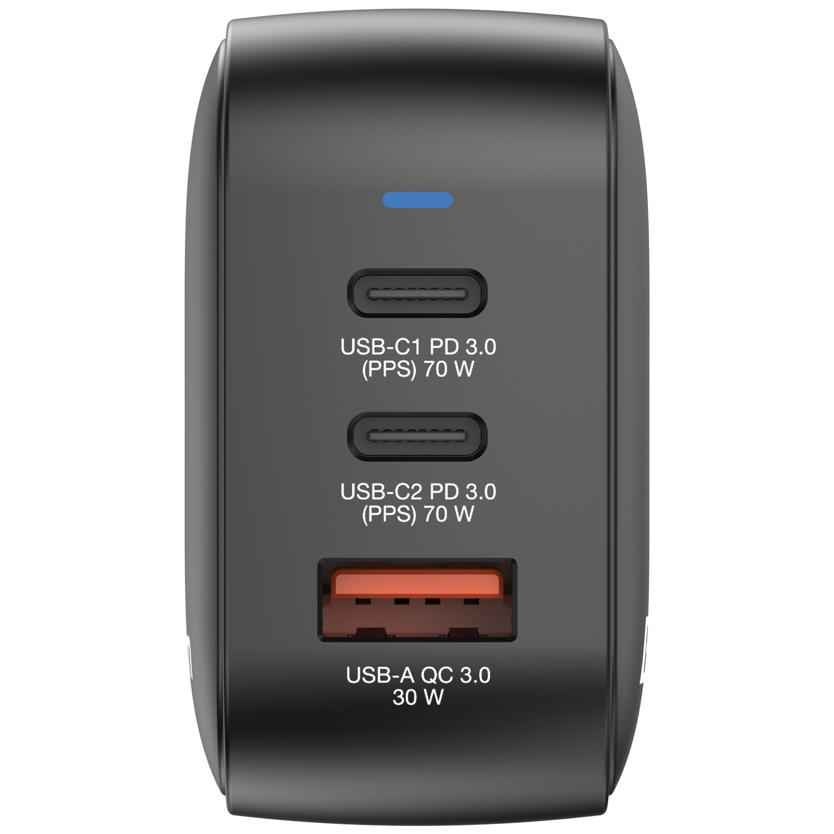 USB Charger VERBATIM Mini GaN Charger 70W, 3 Port (2 USB-C PD 3.0, 1 USB-A QC 3.0), US plug with EU and UK adaptors, fireproof material, black