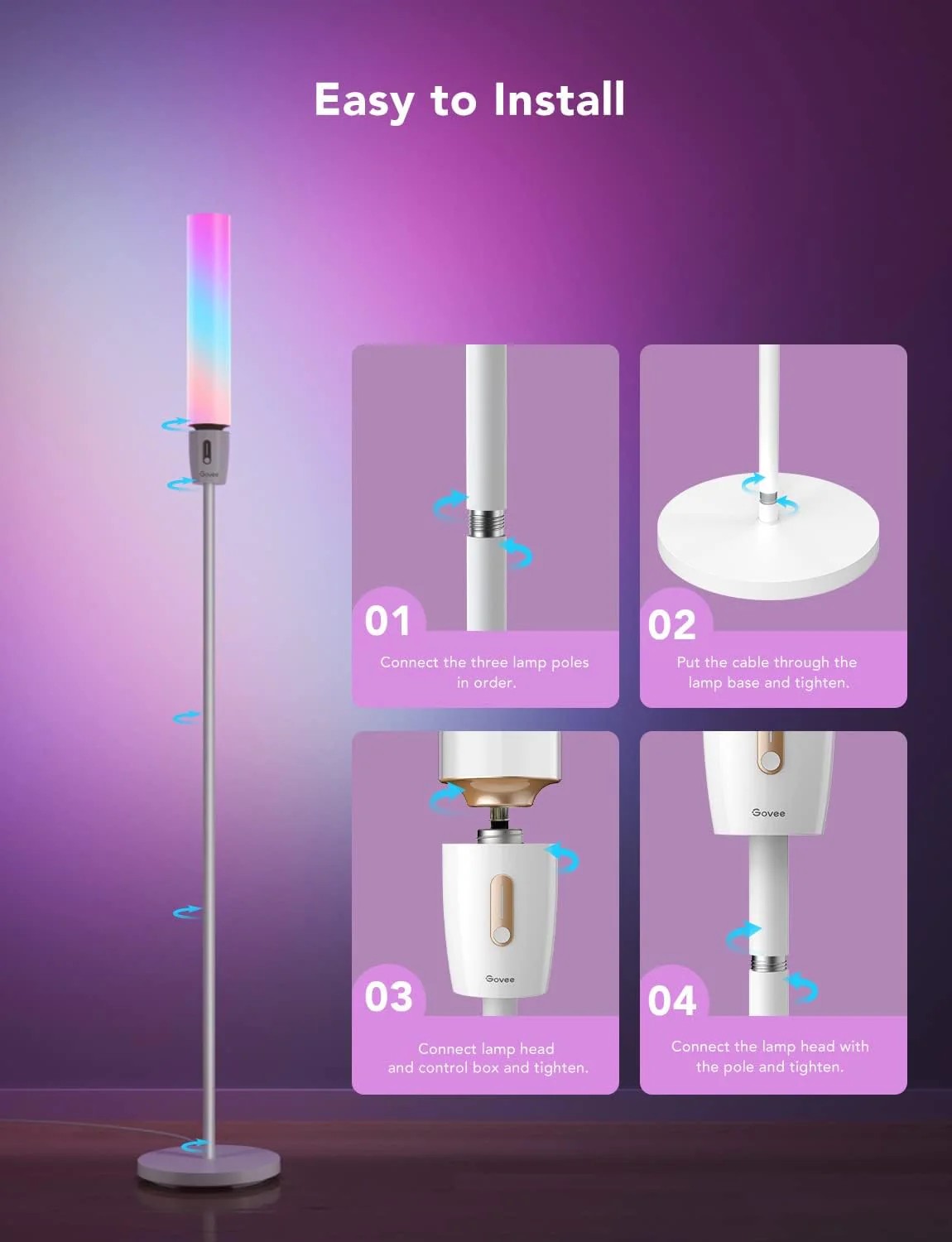 Floor Lamp GOVEE RGBICW Cylinder Floor Lamp, Wi-Fi + BT, Multicolor + Extra White LEDs, Multidirectional Lighting, 360° lighting, 2200k-6500k, 1500 lumens, No Hub Required, 64 Preset Scene Modes, Schedule & Timer Functions, App, Control Box, Voice Control