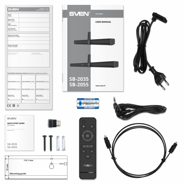 SVEN Soundbar SB-2055, 80 W, Bluetooth, USB, AUX (3.5mm jack), HDMI (ARC), SPDIF (Optical), remote control, LED display, black