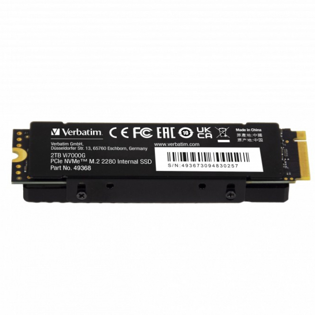 M.2 NVMe SSD 4.0TB Verbatim Vi7000G w/Heatsink, Interface: PCIe4.0 x4 / NVMe 1.4, M2 Type 2280 form factor, Sequential Read 7400 MB/s, Sequential Write 6400 MB/s, Random Read 925K IOPS, Random Write 950K IOPS, DRAM Buffer, TBW: 1400TB, PS5 Compatibile, 3D NAND TLC