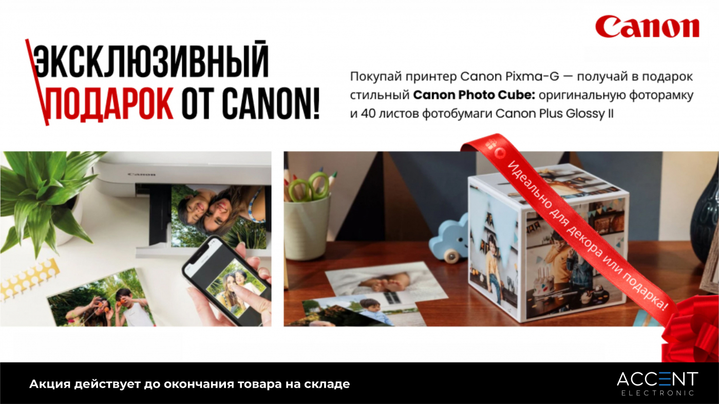 Покупайте принтеры серии Canon Pixma-G и получите эксклюзивный подарок — Canon Photo Cube: стильную фоторамку и 40 листов фотобумаги для ярких снимков прямо у вас дома.